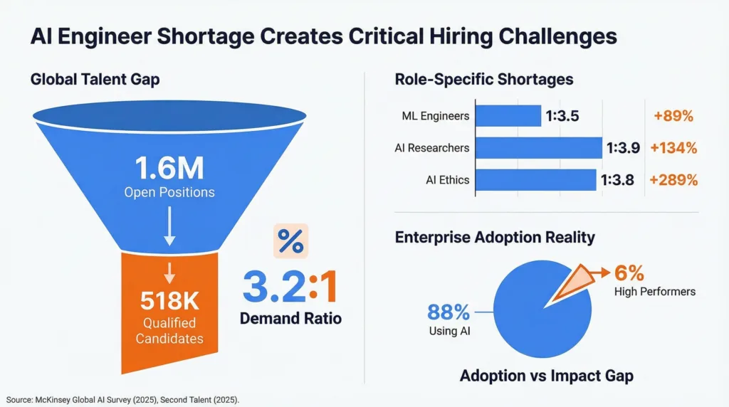 This broken interview process is colliding with the most acute talent shortage in modern history. As enterprises rush to use AI tools inside corporations, the demand for skilled professionals has created a global crisis. A 2025 report on the AI talent market highlights a staggering 3.2-to-1 demand-to-supply ratio, with 1.6 million open AI positions globally and only 518,000 qualified candidates to fill them [3].