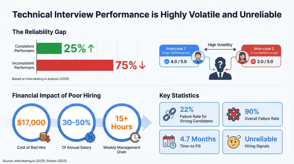 The central flaw of the traditional technical interview is its volatility. Groundbreaking research from interviewing.io, which analyzed hundreds of interviews, found that 75% of candidates perform inconsistently from one interview to the next [4]. A candidate who scores a perfect 4/4 in the morning might score a failing 2/4 in the afternoon with a different company.