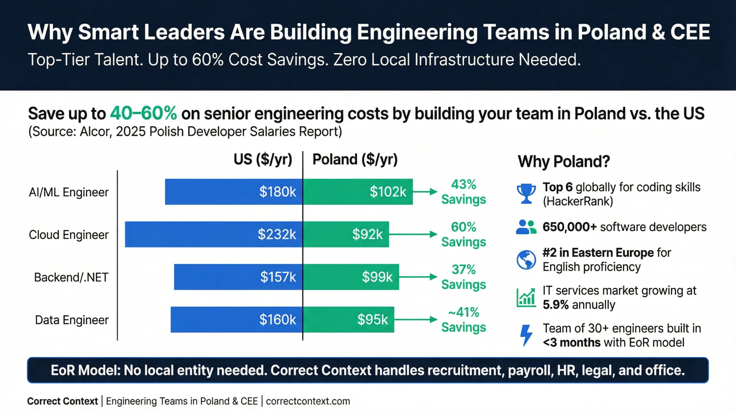 The most compelling factor, however, is the combination of top-tier talent and significant cost savings. A 2025 report found that companies can save up to 40% on total employment costs by hiring Polish developers compared to their US counterparts [4]. A senior AI/ML engineer in the US might cost $180,000 annually, while a similarly skilled professional in Poland would be around $102,480 [4].