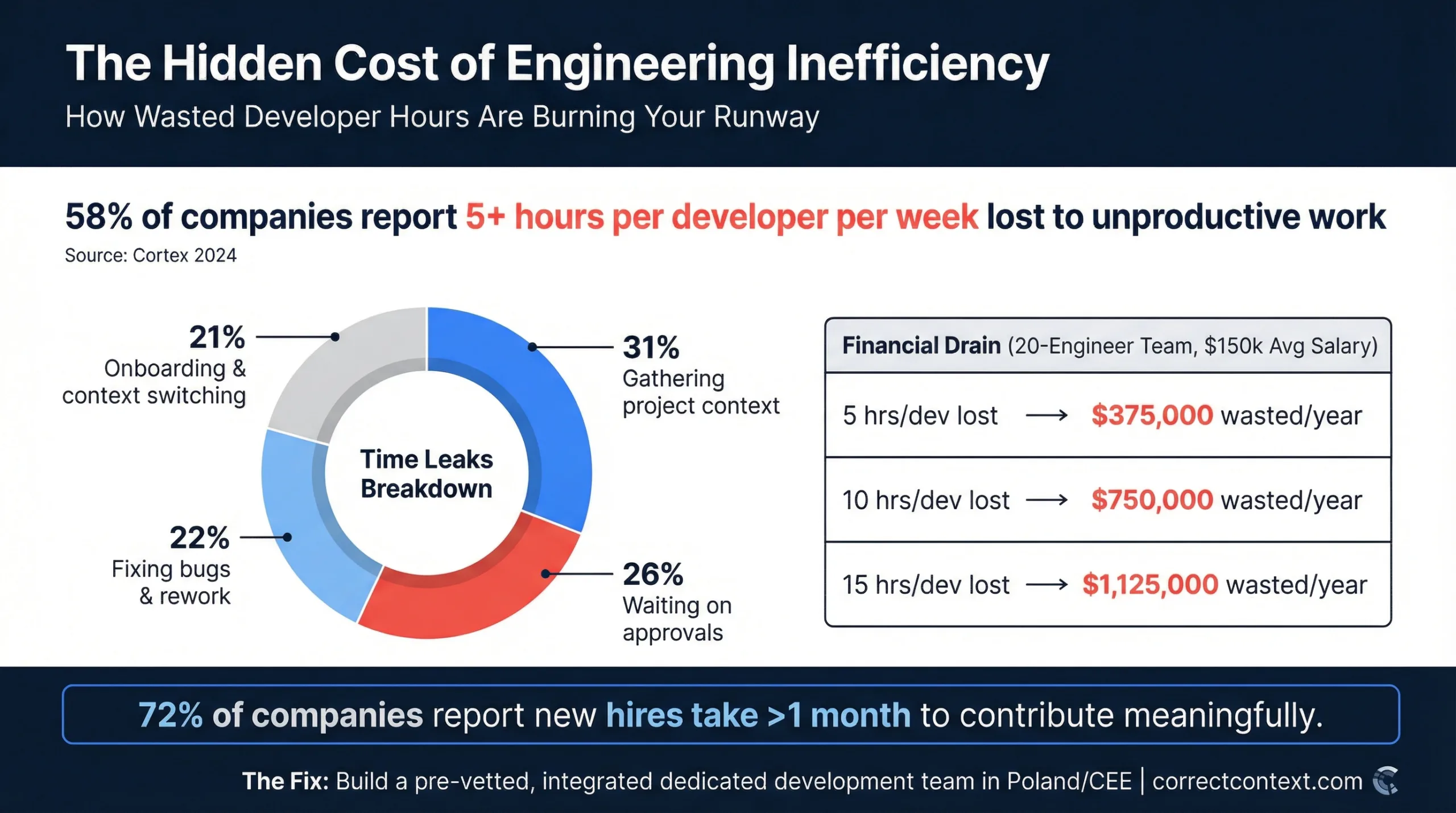 | Productivity Drain | Weekly Hours Lost / Developer | Annual Cost (20-Eng. Team, $150k avg.) |