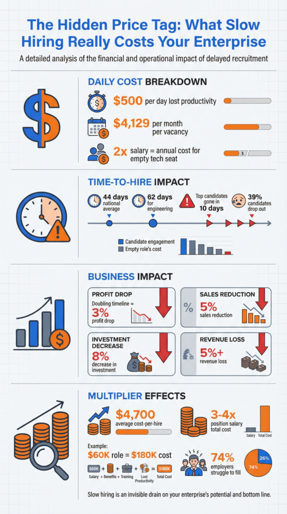 In the fast-paced world of FinTech, Software, and Media, speed is everything. The ability to innovate, adapt, and execute faster than the competition is what separates market leaders from the rest of the pack. Yet, many enterprises are unknowingly sabotaging their own success with a silent killer: a slow engineering hiring process. While it may seem like a minor administrative hurdle, the reality is that every day a critical engineering position remains unfilled, your organization is bleeding revenue, missing deadlines, and stalling its growth engine. This isn’t just a minor inconvenience; it’s a major strategic liability with a staggering price tag.